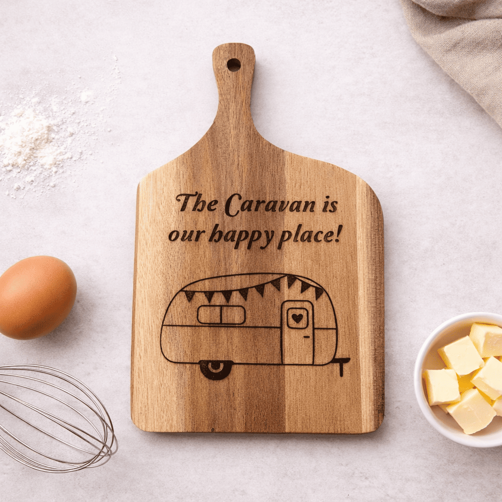 Featuring the beautifully engraved message “The Caravan is our happy place!” alongside a cute vintage caravan illustration, this board is perfect for anyone who loves spending time away in their caravan or holiday home.