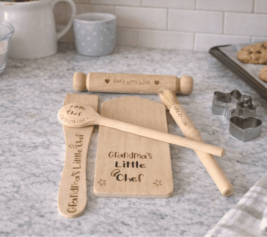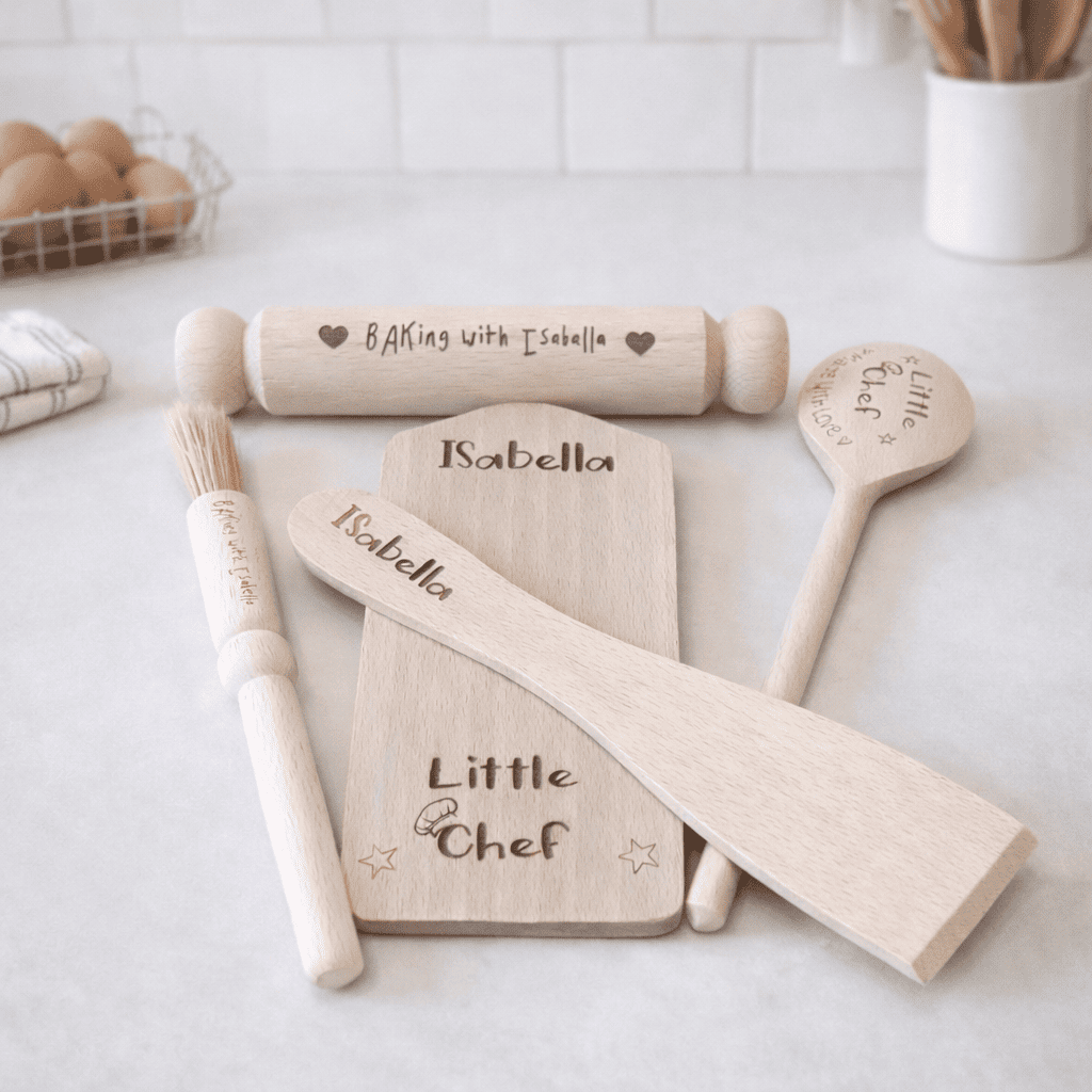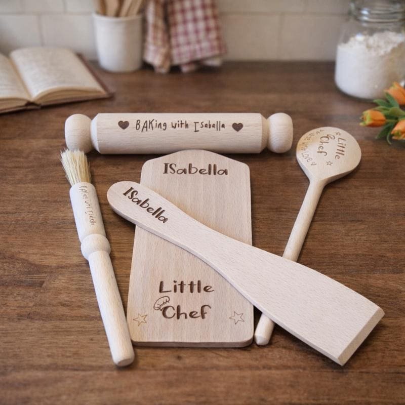 Personalised children’s wooden cooking set engraved with name. 5 piece little chef baking kit perfect for birthdays and Christmas.
