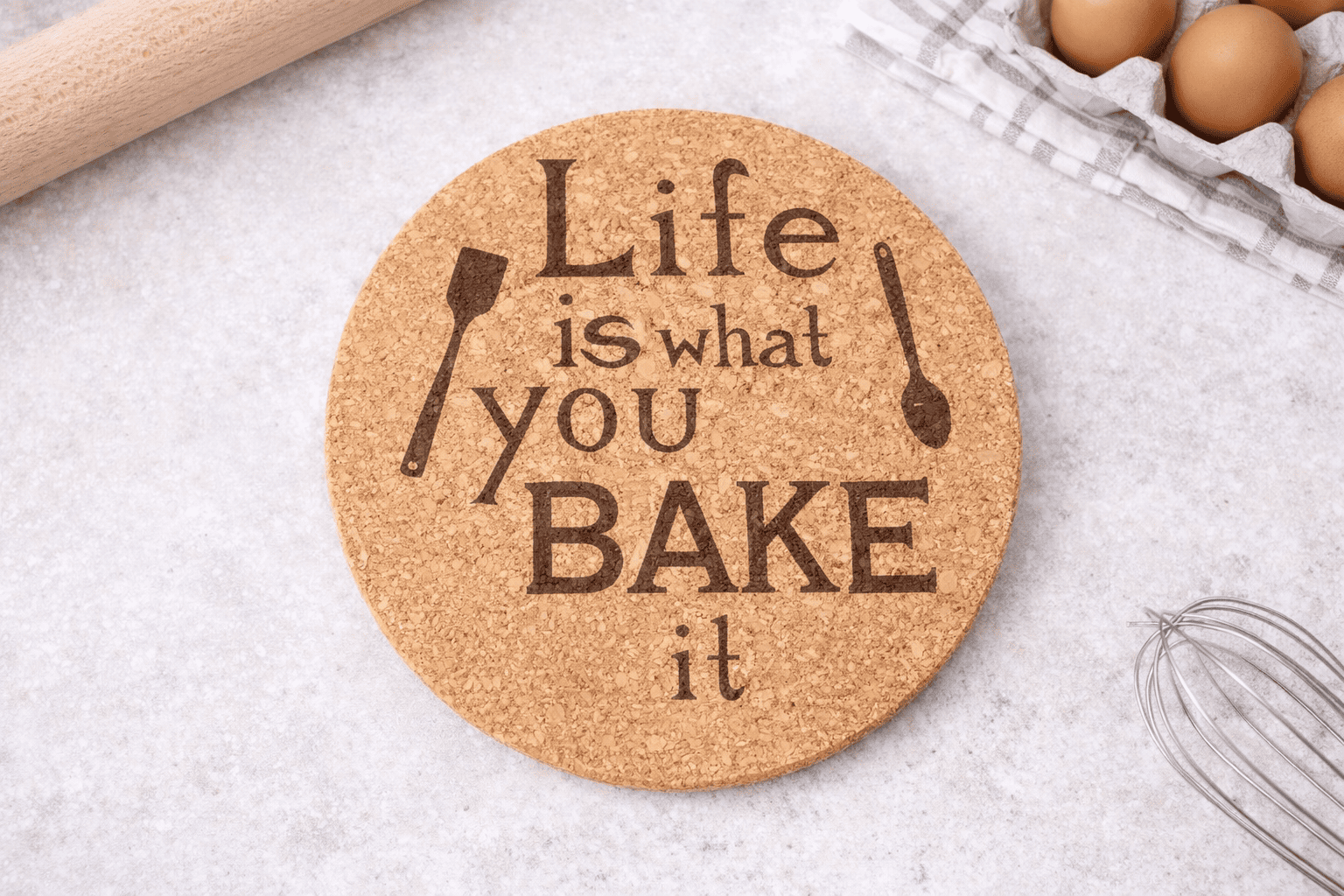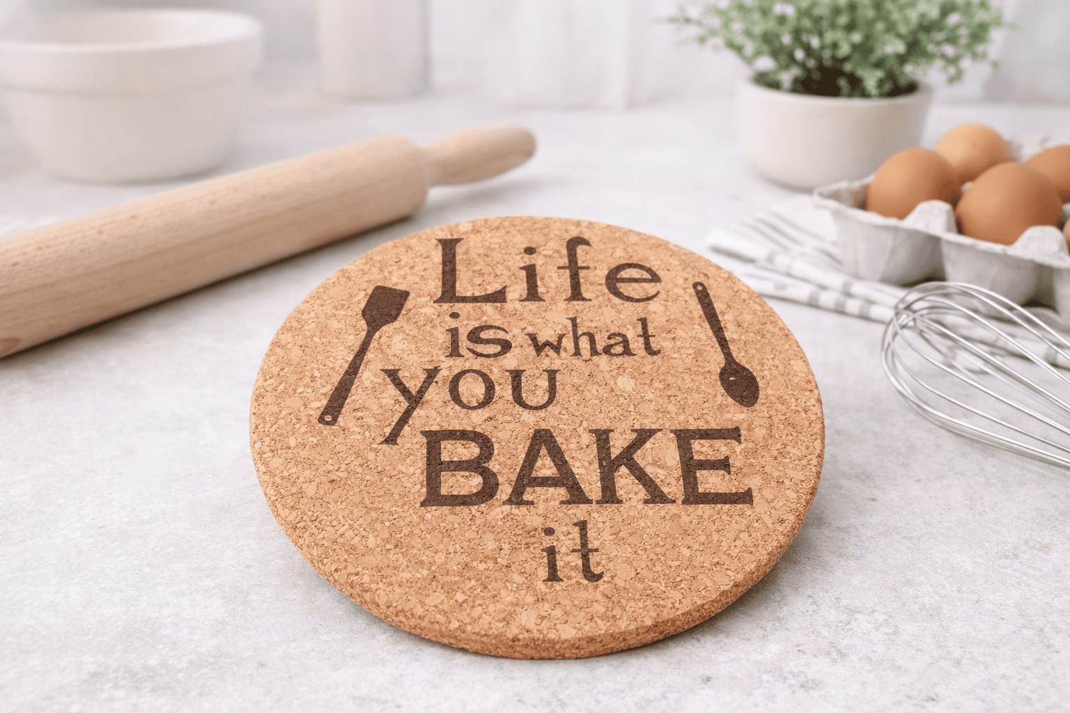 Add a little warmth and humour to your kitchen with this engraved cork trivet featuring the phrase “Life Is What You Bake It”.
