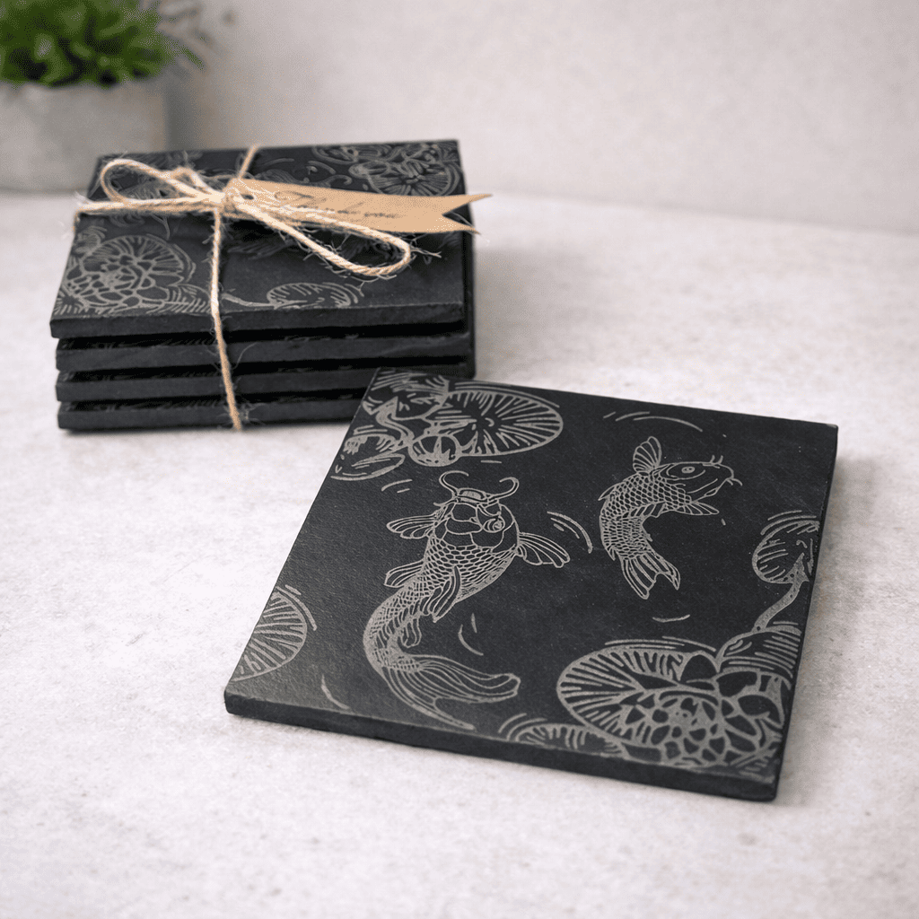 Add a touch of calm elegance to your home or koi pond with these beautifully engraved koi fish slate coasters.