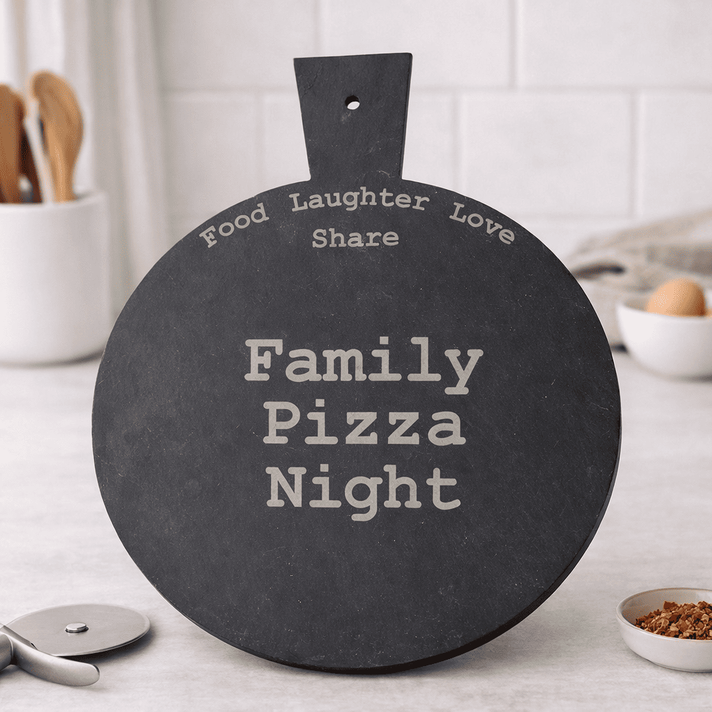Our engraved slate pizza board is designed to bring everyone together — whether it’s a cosy Friday night in, family dinner, or hosting friends. Featuring the popular “Family Pizza Night” design, this board adds a fun and personal touch to your table while being fully functional for serving and sharing.