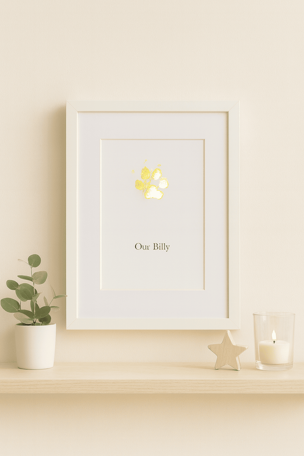 Each framed print is hand-foiled using your pet’s actual paw impression, creating a meaningful memorial or celebration piece for your home. Whether remembering a beloved companion or capturing a special moment, this timeless design is made to treasure forever.