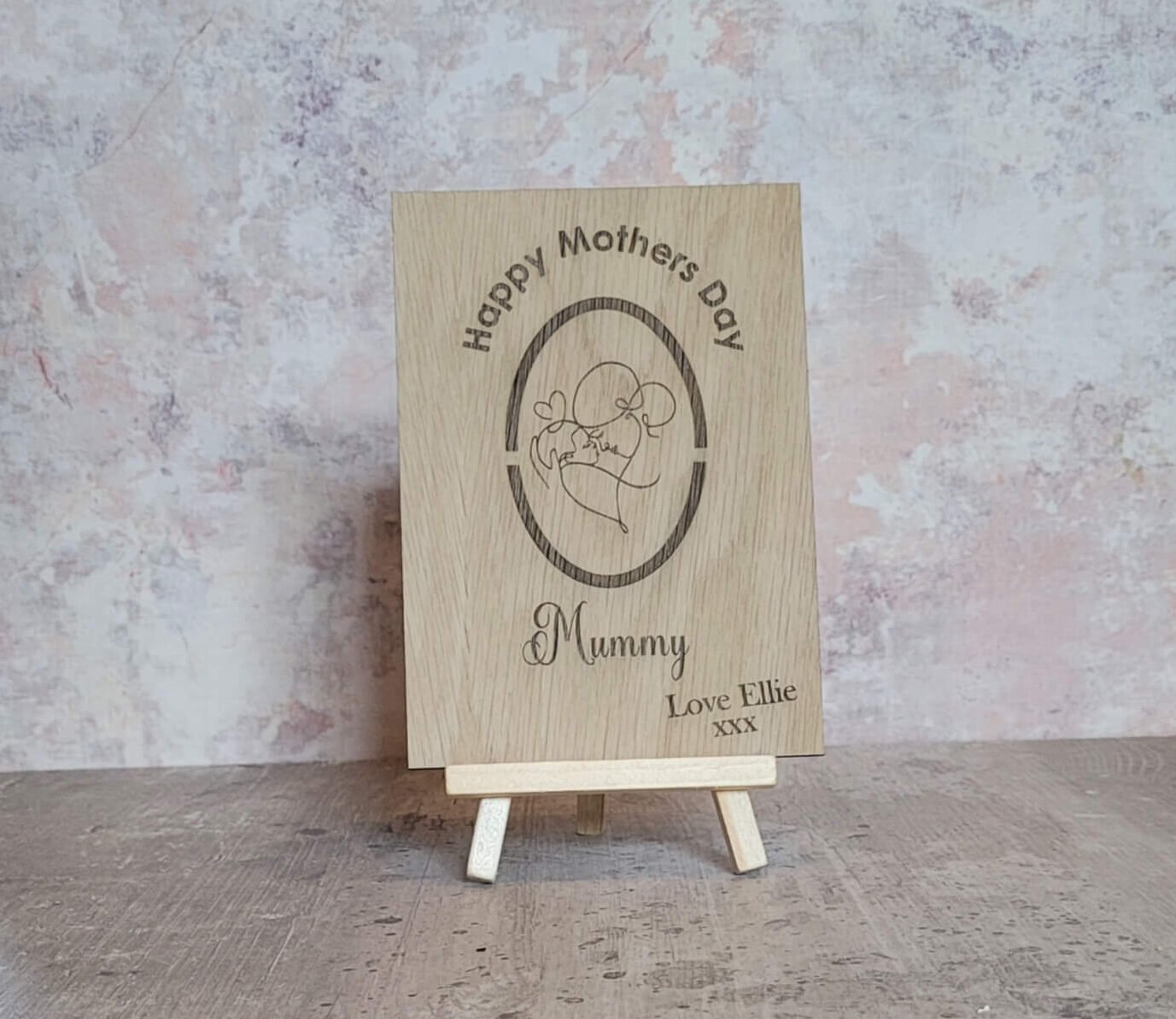This personalised wooden Mother’s Day card features a beautifully engraved outline illustration of a mum holding her baby, making it a meaningful keepsake she can display long after Mother’s Day has passed.