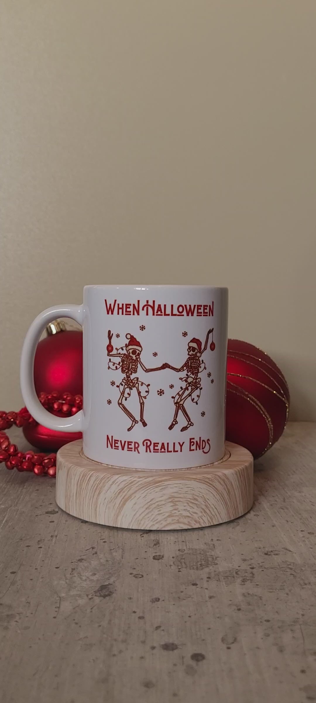 Our Merry & Fright mug is the perfect crossover for anyone who loves a touch of spooky season even when the tinsel’s out. Featuring a Santa-hat skull flashing a peace sign and surrounded by snowflakes, it’s the ideal gothic twist on a classic Christmas mug.